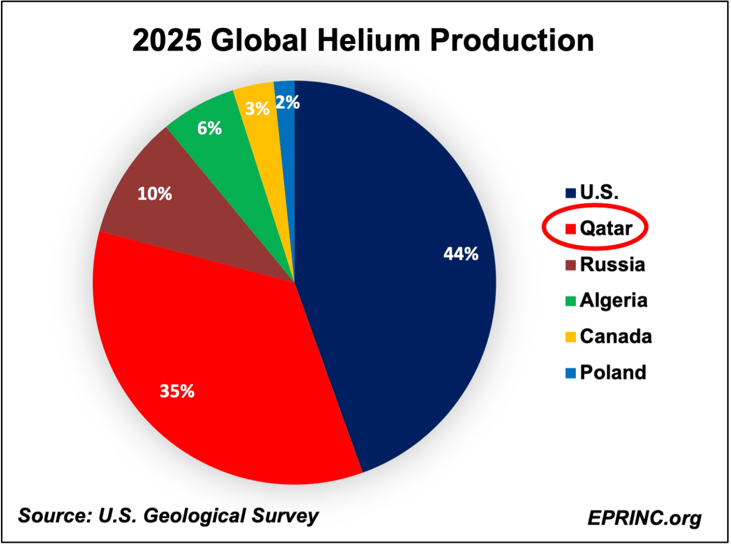Politico drew on EPRINC’s Chart of the Week data to note that while the U.S. leads global helium production at 44 percent, Qatar is the second-largest producer at 35 percent — and that war damage to Qatari facilities could take years to repair, tightening an already thin market.